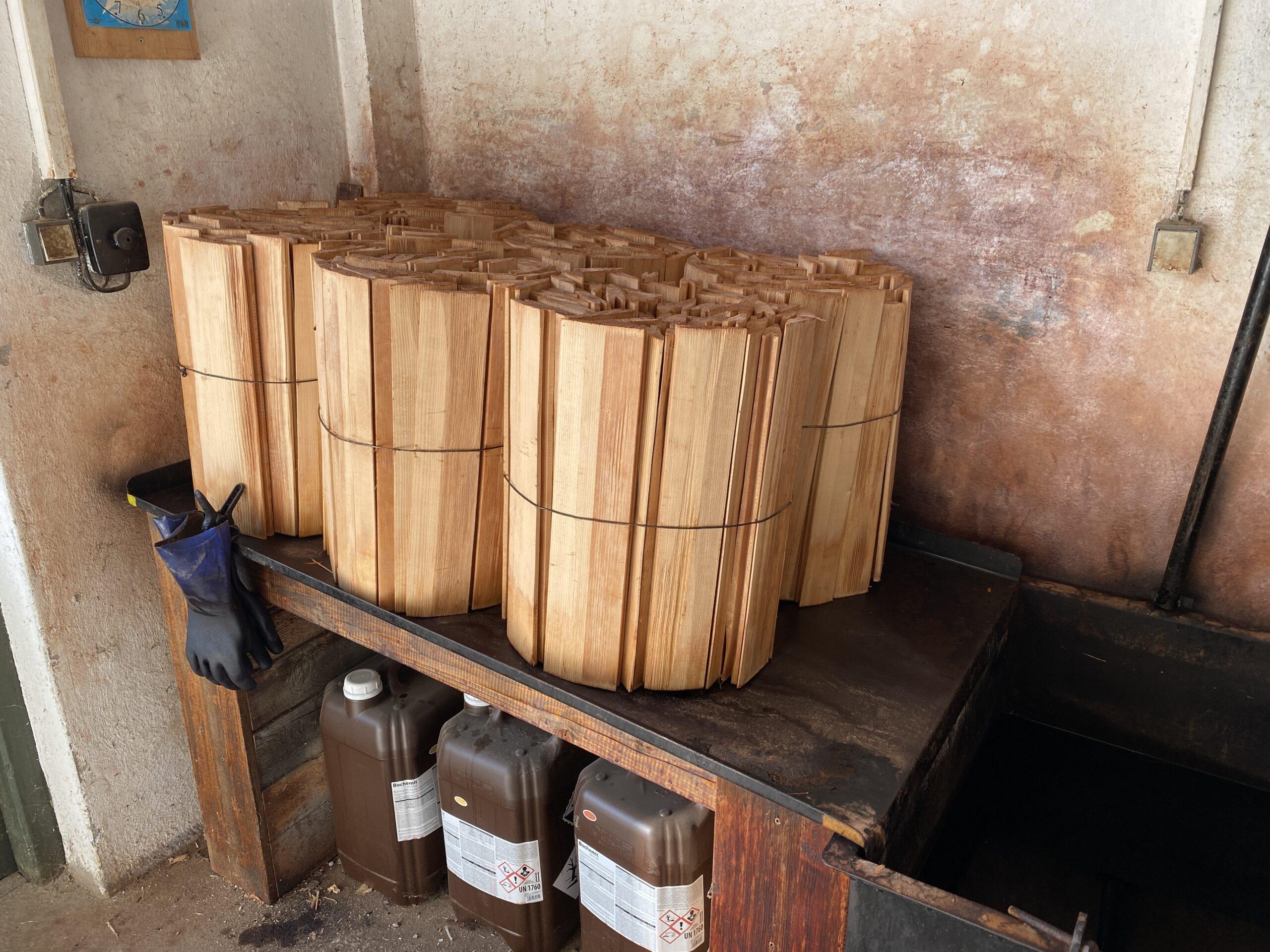 Každý šindel prochází frézováním drážky a péra pro snadnou montáž. Následně se přirozeně suší po dobu tří měsíců.