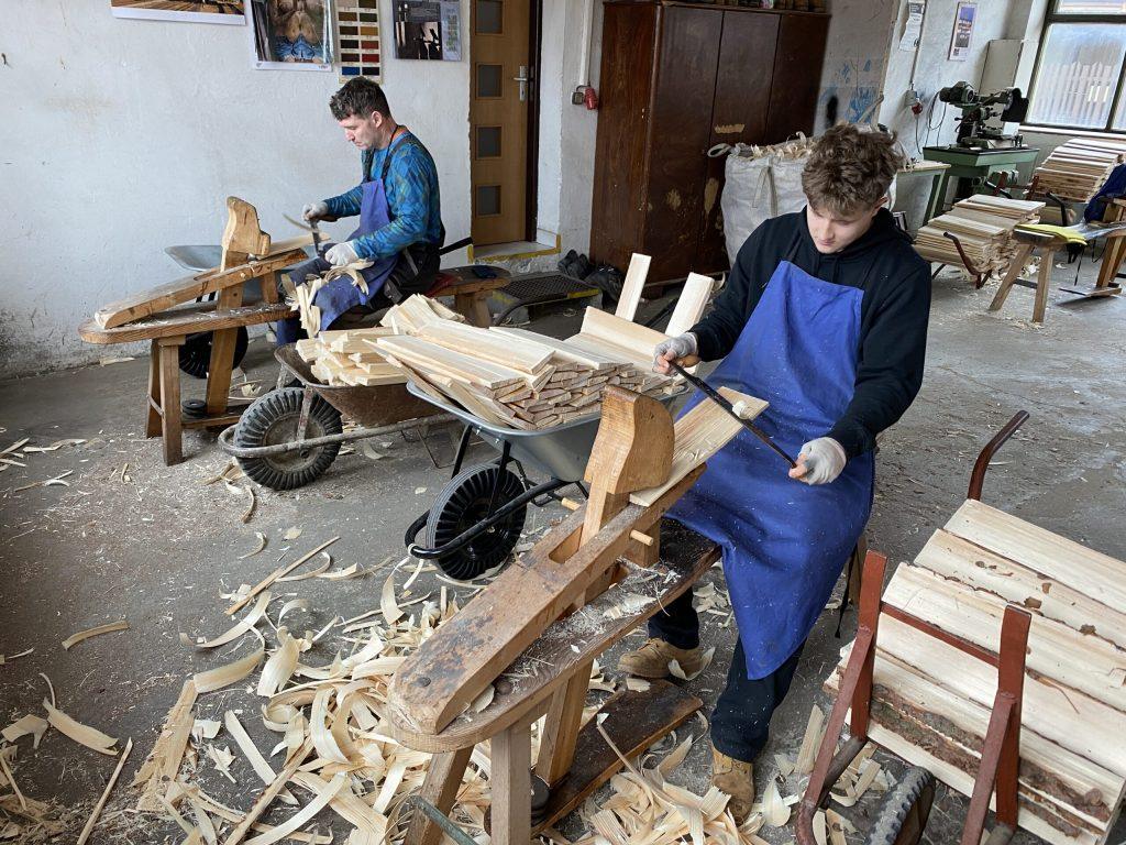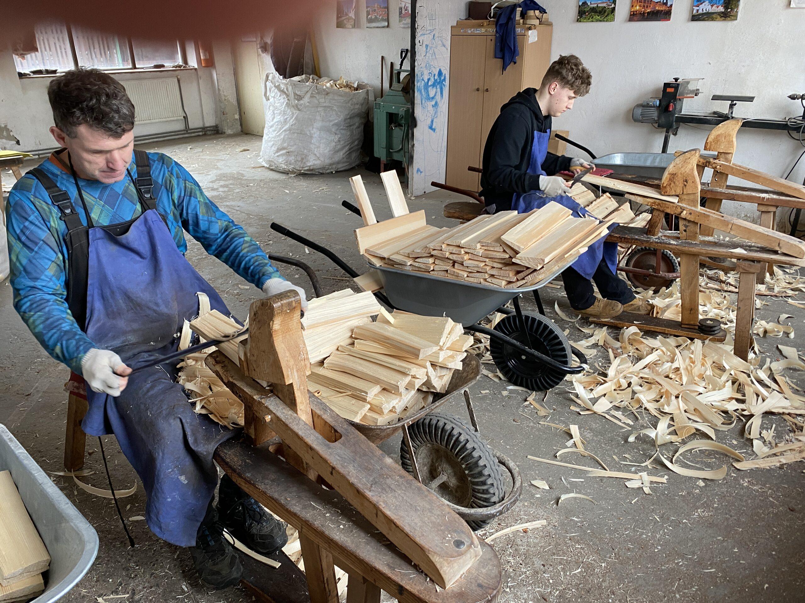 Dřevo se pečlivě štípe a ručně opracovává pořízem nebo hobluje, čímž získává tradiční vzhled a vysokou životnost.